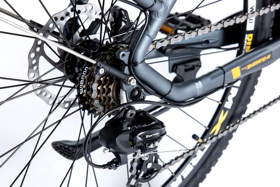 - TRANSMISSION SHIMANO: Tous nos produits sont équipés par SHIMANO, dans ce cas un Dérailleur arrière SHIMANO RD-TY-300, 7vitesses, et manette SHIMANO SL-TX50 avec poussoir et pignon SHIMANO MF-TZ500-7.